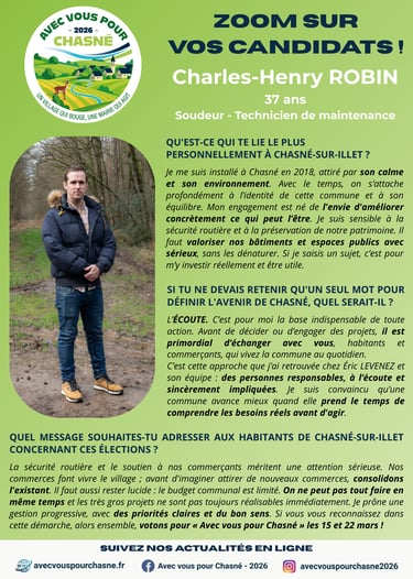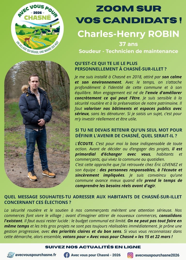 Rencontrez Charles-Henry ROBIN, 37 ans ! Installé à Chasné depuis 2018, il souhaite mettre sa motivation au profit de la sécurité routière et de l'entretien de notre village. Convaincu que l'écoute est la base de toute action, il s’engage à échanger avec vous, habitants et commerçants, pour comprendre vos besoins réels avant d'agir.