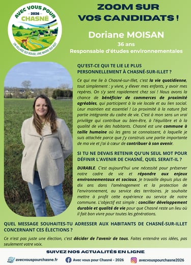Rencontrez Doriane MOISAN ! Forte de 10 ans d'expérience dans le domaine de l'environnement, elle rejoint notre équipe à 36 ans avec un objectif clair : bâtir un avenir durable pour Chasné-sur-Illet !