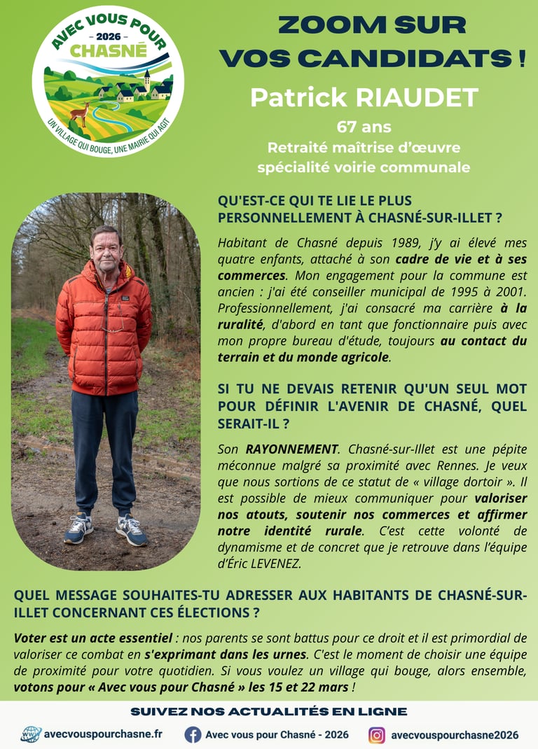 Rencontrez Patrick RIAUDET, 67 ans ! Habitant de Chasné depuis 1989 et ancien élu, ce professionnel de la voirie souhaite mettre son savoir-faire au profit du cadre de vie des Chasnéens, en misant sur une communication efficace pour faire rayonner notre village.