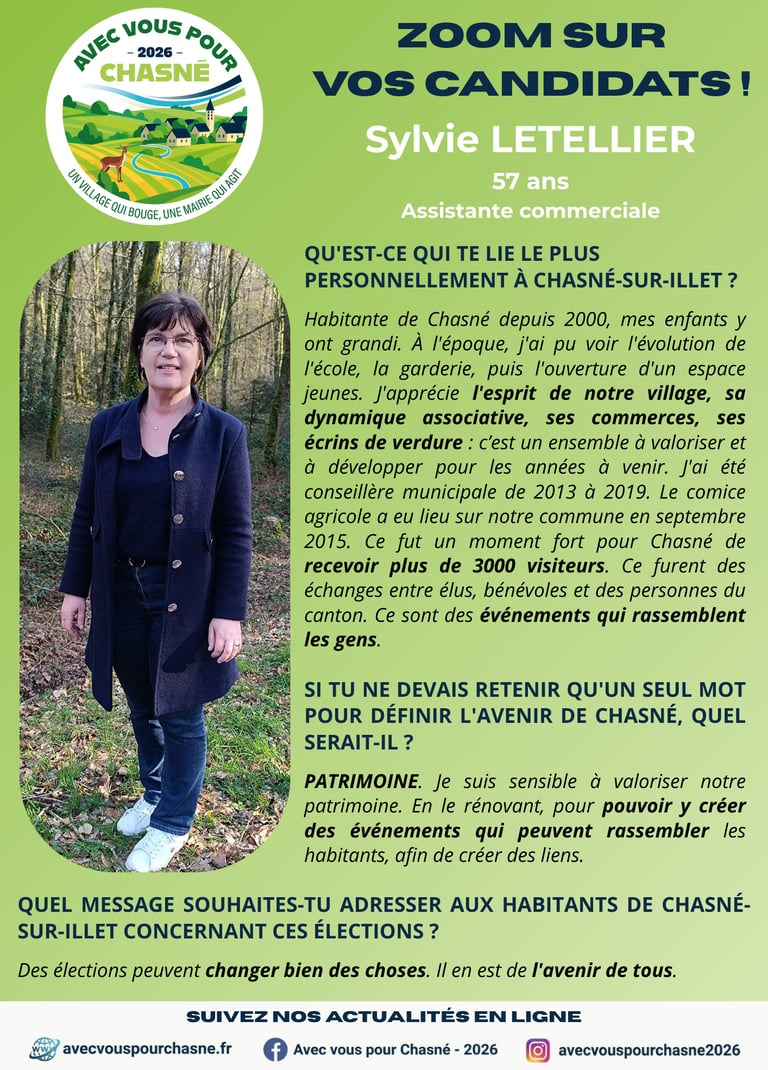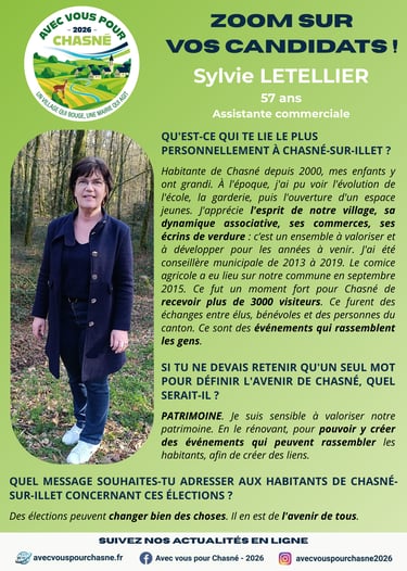 Faites la connaissance de Sylvie LETELLIER, 57 ans ! Habitante de Chasné depuis 2000 et ancienne conseillère municipale (2013-2019), elle a activement participé au succès du comice agricole de 2015. Forte de cette expérience, Sylvie souhaite aujourd'hui rénover notre patrimoine pour en faire un levier de rassemblement et créer de nouveaux liens entre tous les habitants.