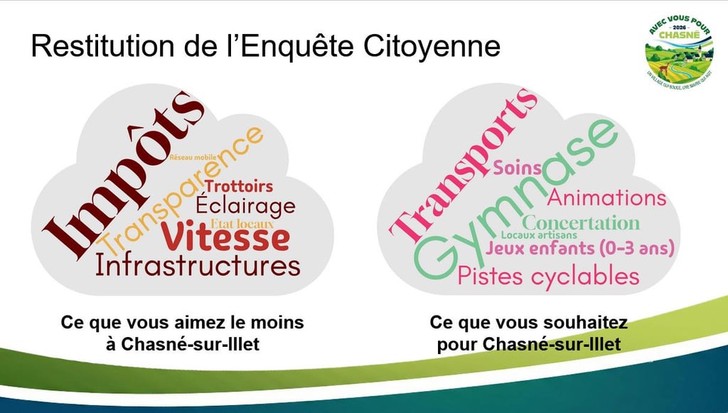 Parce qu’un projet municipal ne se construit pas à huis clos, nous avons placé la parole des Chasnéens au centre de notre démarche. Découvrez les résultats complets de notre enquête citoyenne : une analyse précise des attentes de notre commune qui a servi de fondation à chacun de nos engagements pour ce dimanche.